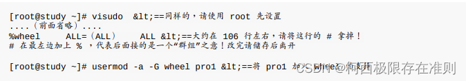 除了 root 之外的其他帐号,若想要使用 sudo 执行属于 root 的权限指令,则 root 需要先使用 visudo 去修改 /etc/sudoers ,让该帐号能够使用全部或部分的root 指令功能。为什么要使用 visudo 呢?这是因为 /etc/sudoers 是有设置语法的,如果设置错误那会造成无法使用 sudo 指令的不良后果。因此才会使用 visudo 去修改, 并在结束离开修改画面时,系统会去检验 /etc/sudoers 的语法就是了。
