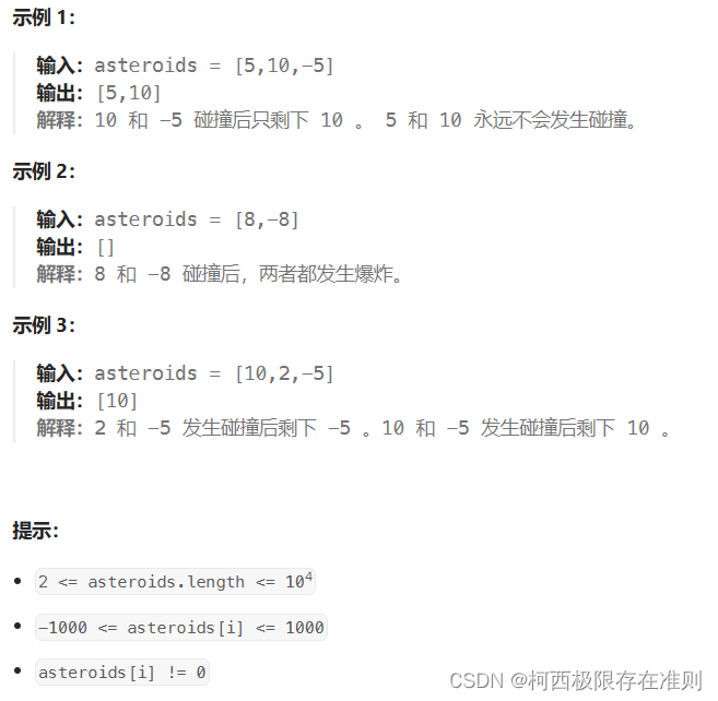 题目:给定一个整数数组 asteroids,表示在同一行的小行星。