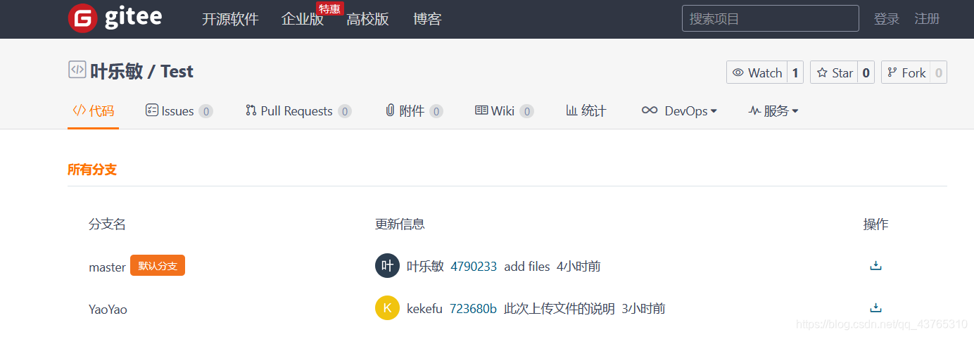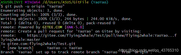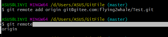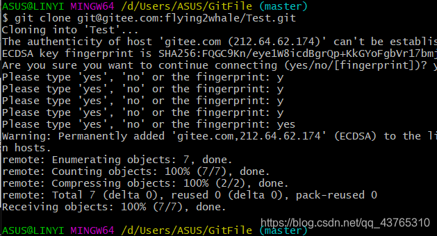 再输入:git clone git@gitee.com:flying2whale/Test.git,回车后: