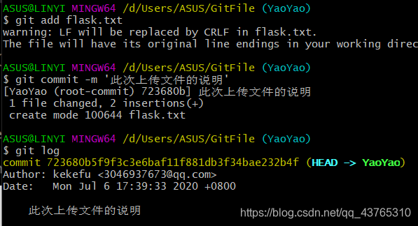 添加文件到缓存位置,git add flask.txt;上传文件说明,git commit -m " 文件说明";打印日志,git log。