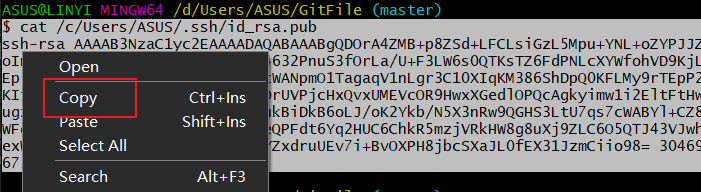 输入 cat /c/Users/ASUS/.ssh/id_rsa.pub,回车,选中回车后得到的密钥字符串,右键,copy,发给项目创始人(发给叶)。