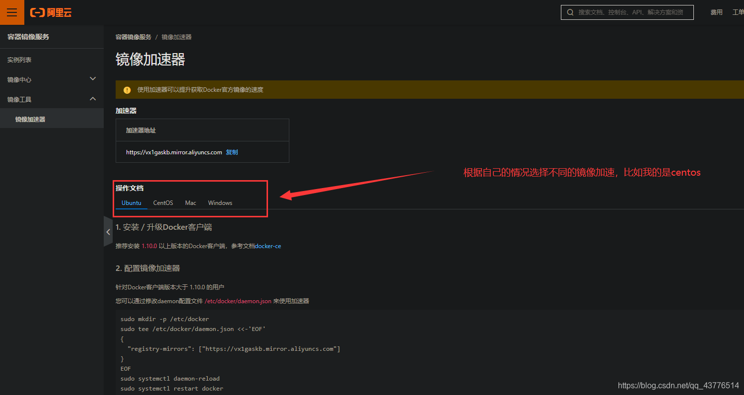 3、根据自己实际情况选择不同操作系统的镜像加速