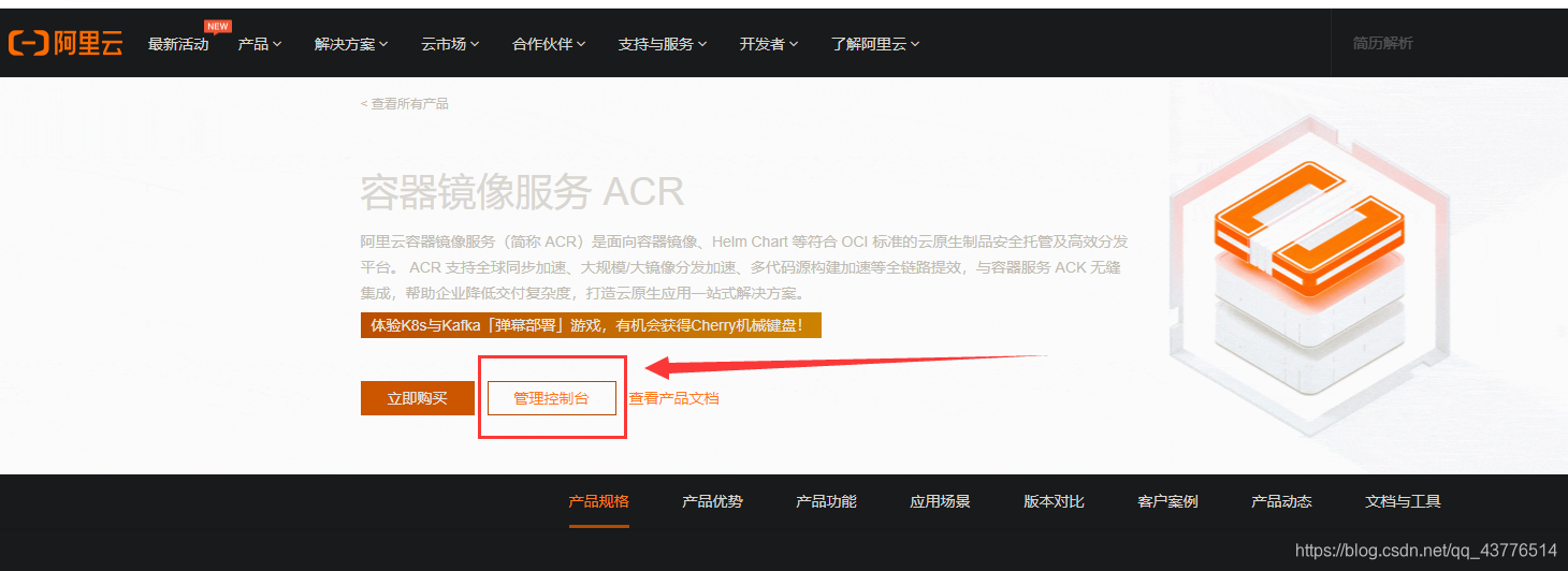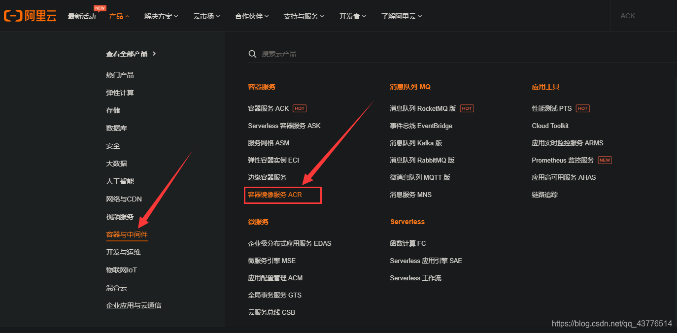 2、点击进入容器镜像服务ACR,然后进入容器镜像管理控制台