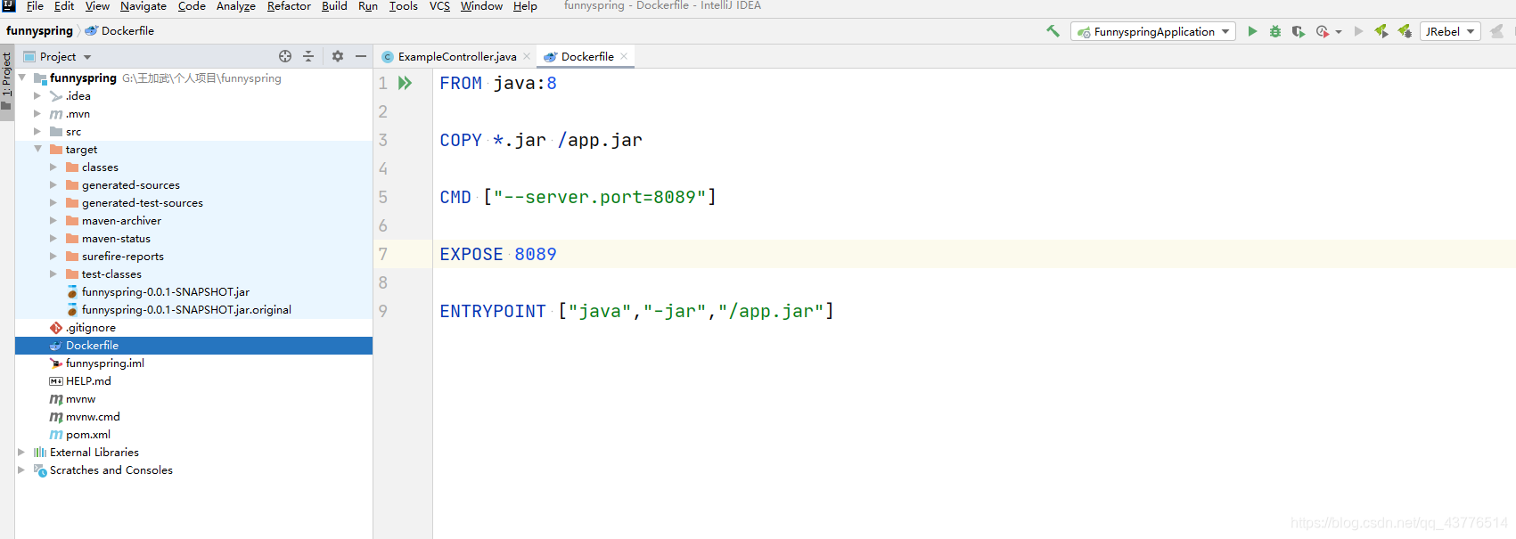 然后将Dockerfile文件和 funnyspring-0.0.1-SNAPSHOT.jar上传到idea目录中,这个使用FinalShell手动传即可,很方便!