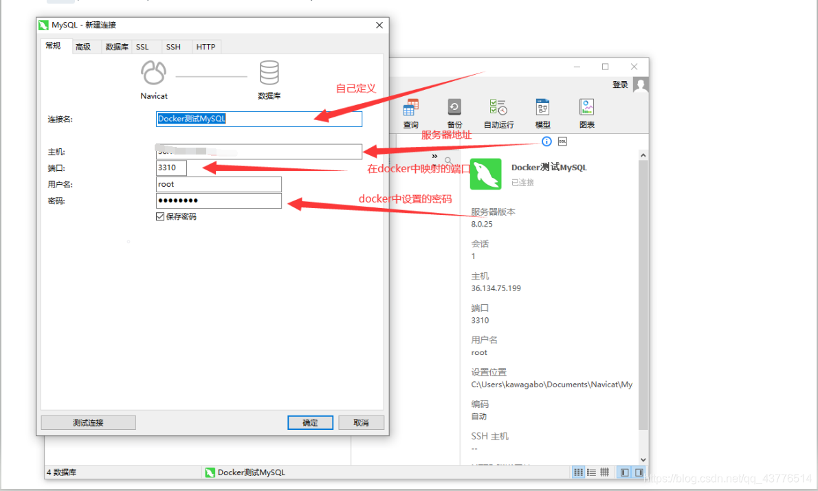 3、启动之后我们在本地使用navicat来连接测试,navicat和容器内的3306端口进行映射