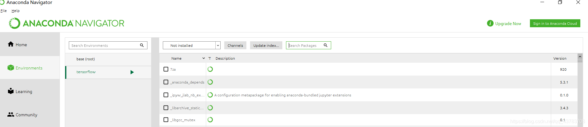 - 点击tensorflow右边的启动按钮,可以在右边选择你需要的插件模块进行下载,如果下载时出现版本不同的问题,可根据提示建议做出后续调整修改(比cmd下的人性化多了吧!!!)