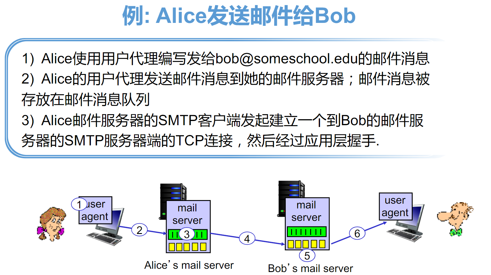 3:邮件服务器:服务器端,使用邮箱保存客户端发送的邮件信息,外出消息队列,运行邮件协议。 - 邮件发送协议SMTP:使用TCP建立连接,从发送服务器到接受服务器直接传送,服务器端口号25,RFC2821