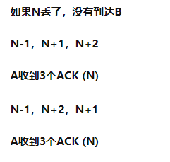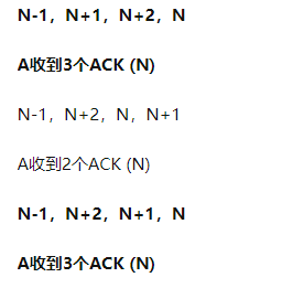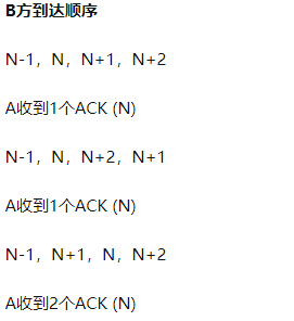 答:假定通信双方如下,A发送4个TCP Segment 给B,编号如下,N-1成功到达,因为A收到B的ACK(N),其它按照到达顺序,分别收到ACK(N)的数目。A方发送顺序N-1,N,N+1,N+2