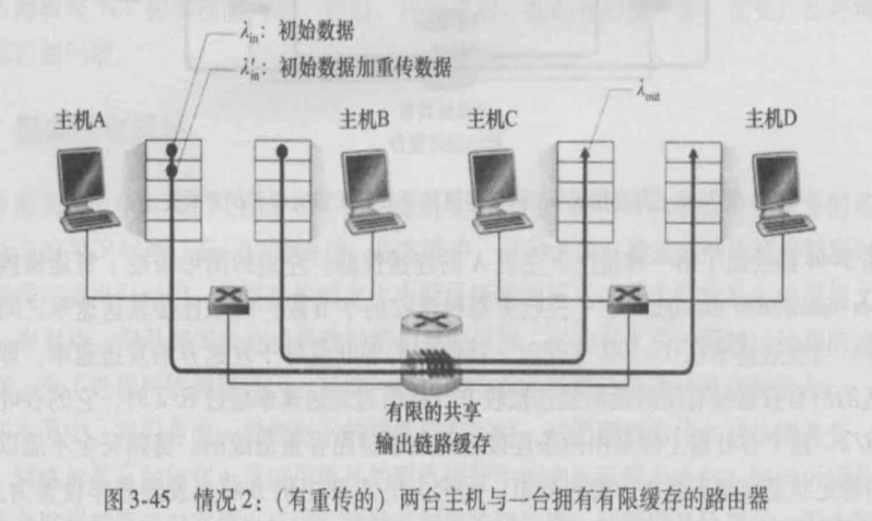 初始条件:存在路由器缓存满,分组溢出丢弃,TCP重传。λin 字节/秒表示应用程序将原始数据发送到套接字中的速率。引入λ’in 字节/秒表示分组丢失,传输层向IP网络中发送报文段的速率。