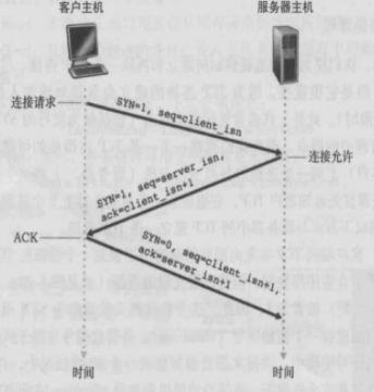 - 三次握手(three-way handshake):客户首先发出特殊的TCP报文段,服务器反馈一个TCP报文段,客户再使用第三个TCP报文段作为响应。(前两个不包含数据,第三个可以包含数据。)