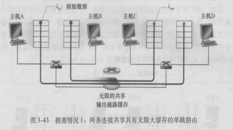 - 初始条件:假设主机A、B都以 λin字节/秒 的速率将应用数据发送到连接中,来自A、B的分组经过一台路由器,在一段容量为 R 的共享式输出链路上传输。