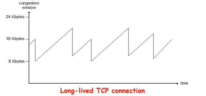 - 平均吞吐量:忽略慢启动,窗口大小为W,当前往返时间为RTT,则吞吐量为W / RTT。丢包发生后,窗口大小降低为W/2,则吞吐量为W/(2*RTT),然后继续增大到W/RTT后再次发生丢包,如此重复。故平均吞吐量为0.75* W/RTT。