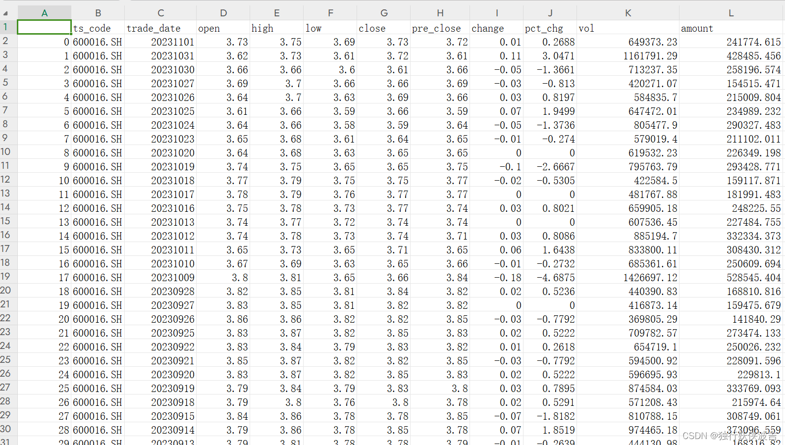 msy = pro.daily(ts_code='600016.SH', start_date='20170101', end_date='20231101') # ts_code='600016.SH'民生银行股票代码,可以任取别的代码,随意啦