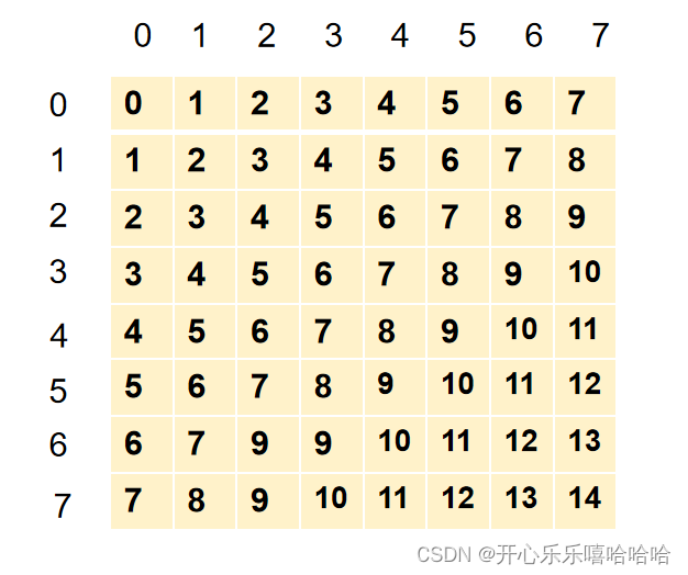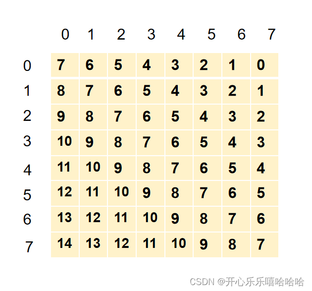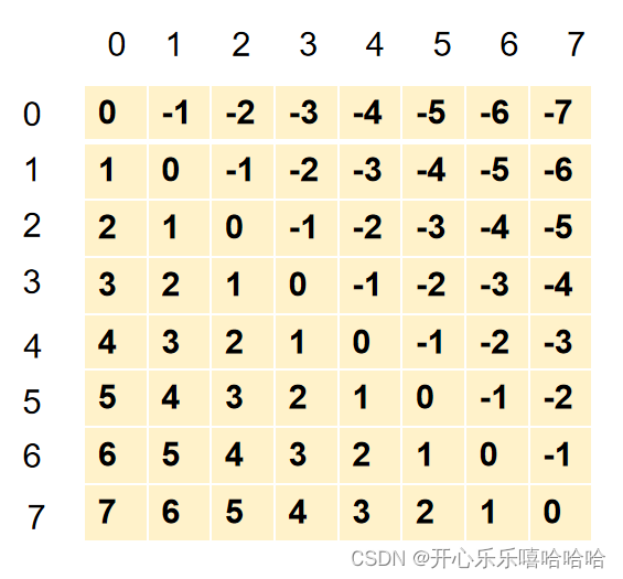 判断对角线被占领:用行减去列,可以得到下图,若在同一个对角线则行减去列值相等,设置boolean数组diag进行判断,true表示未被占领,false表示已被占领。