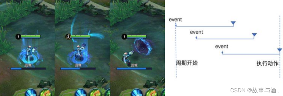 拿王者荣耀举栗子,狄仁杰在回城时,在这8s内,如果遭到其他英雄的攻击,就会取消回城,回城这个动作需要重新触发,也就是重新调用回城这个动作,8s后才能回到泉水。
