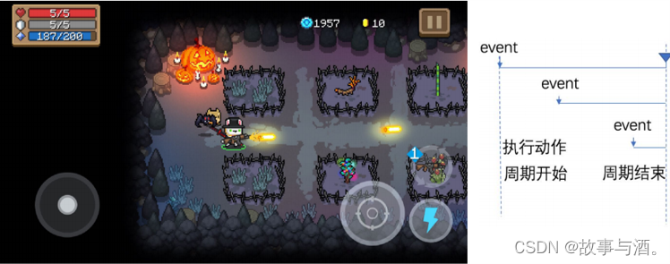 还是举个栗子,如图所示,就像fps射击类游戏,或者王者荣耀里的普通攻击,子弹射出的数量或者普通攻击的速度不会随着我们点击攻击键的加快而加快。它是当执行完了上一个动作才会执行下一次。