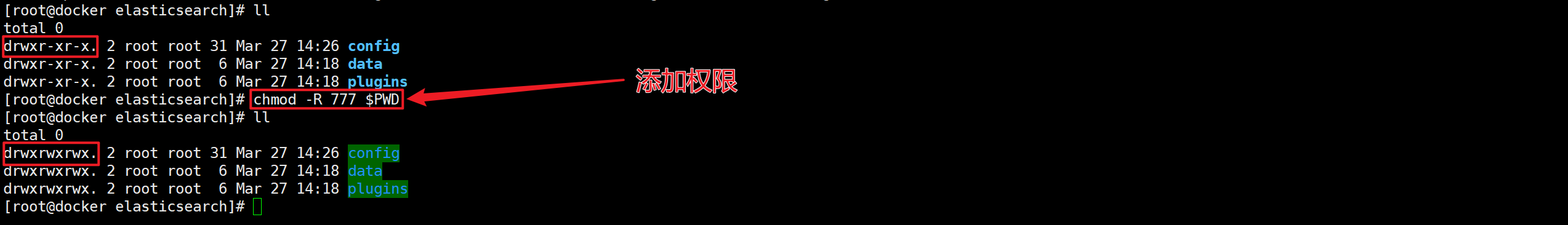 查看 elasticsearch 目录,给目录添加权限。