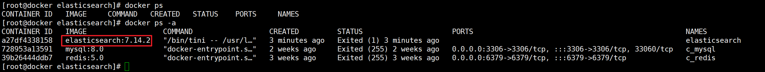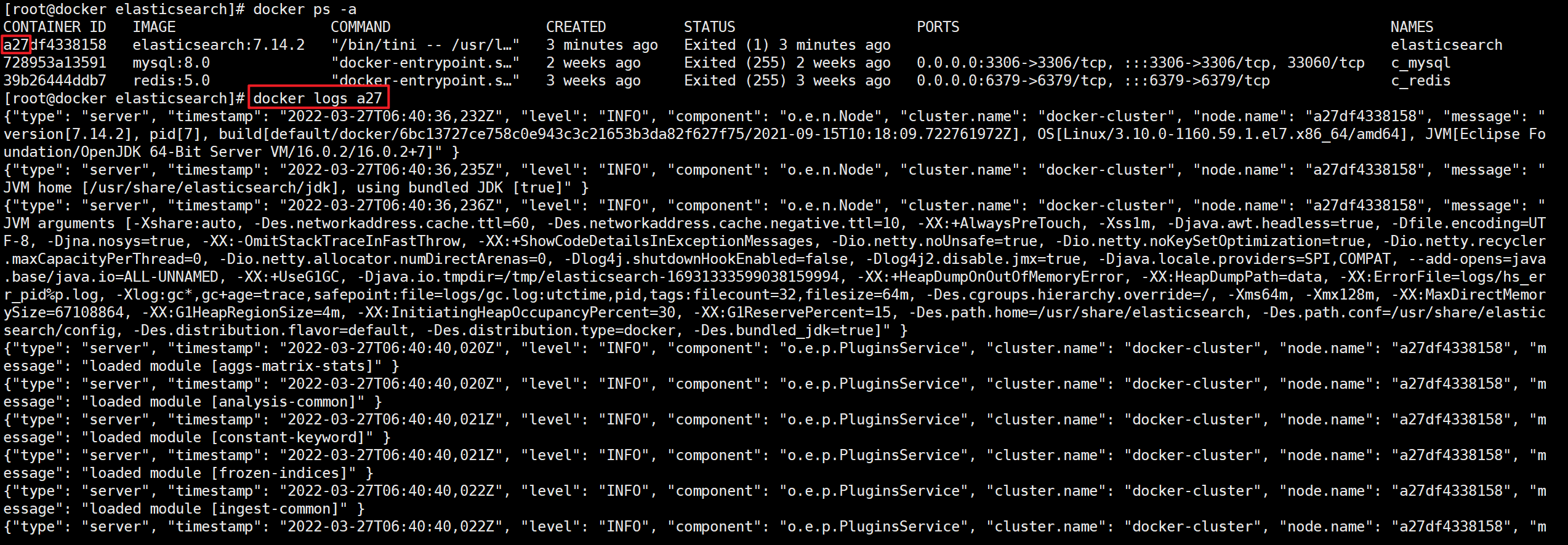 说明:elastisearch 是容器的名称,也可以使用容器 id 的前三位(如:a27)