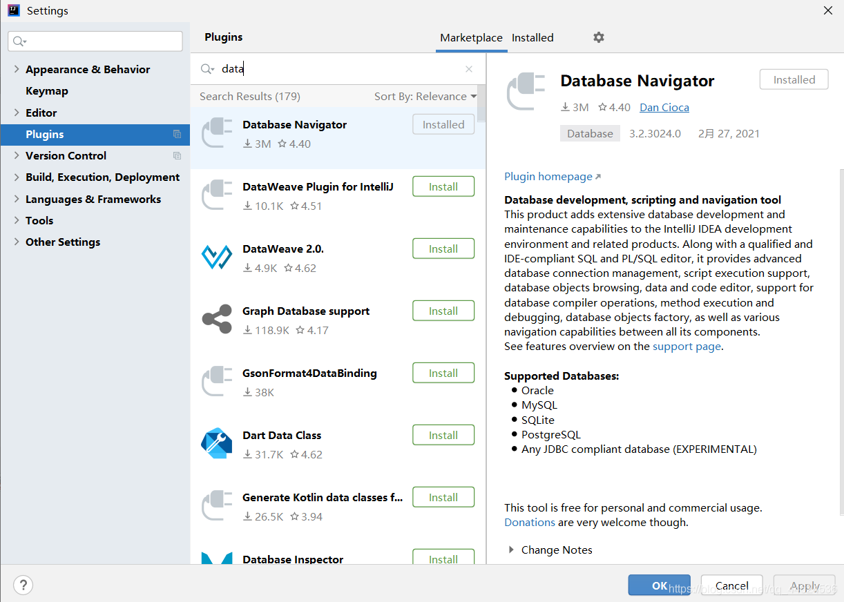 IDEA社区版默认是不支持database连接的,需要自己手动下载一个Database Naviga