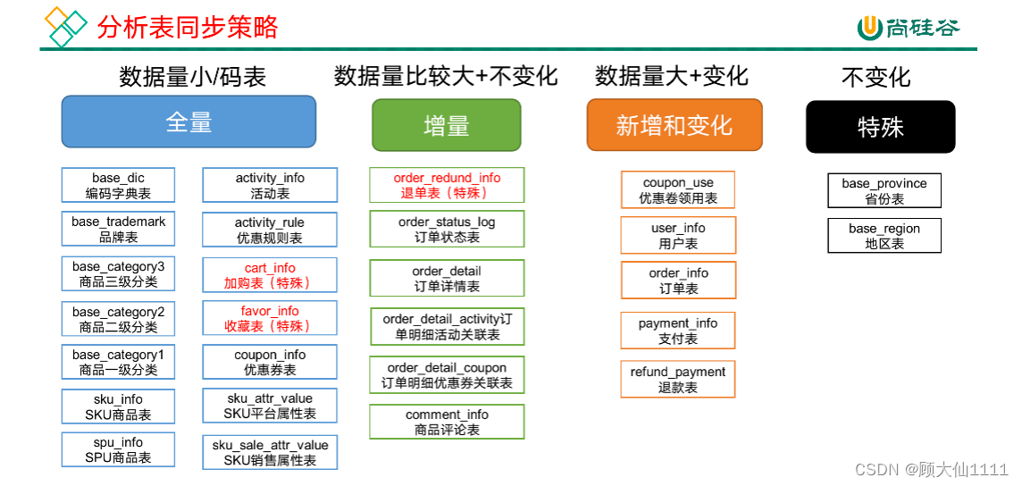 某些特殊的表,可不必遵循上述同步策略。例如某些不会发生变化的表(地区表,省份表,民族表)可以只存一份固定值。