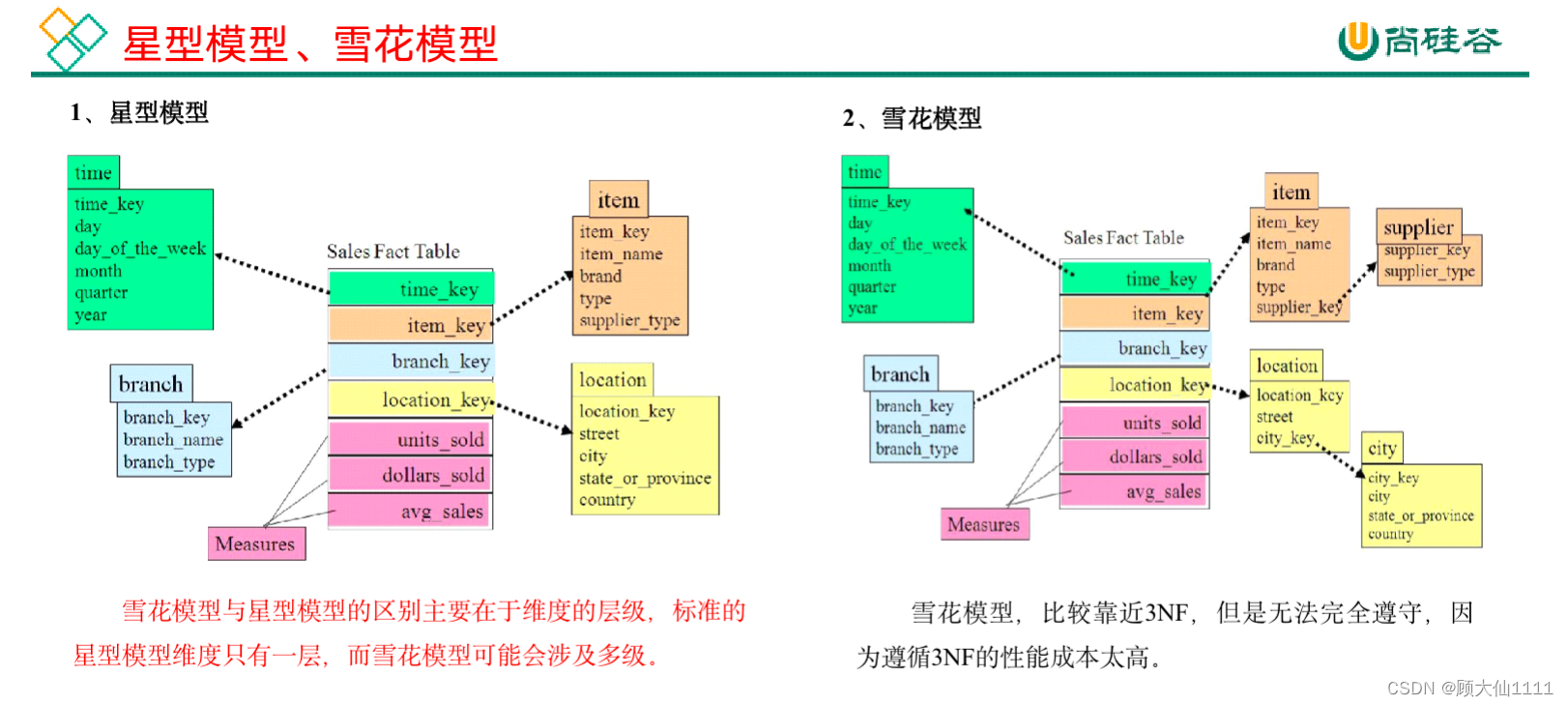 维度模型以数据分析作为出发点,不遵循三范式,故数据存在一定的冗余。维度模型面向业务,将业务用事实表和维度表呈现出来。表结构简单,故查询简单,查询效率较高。