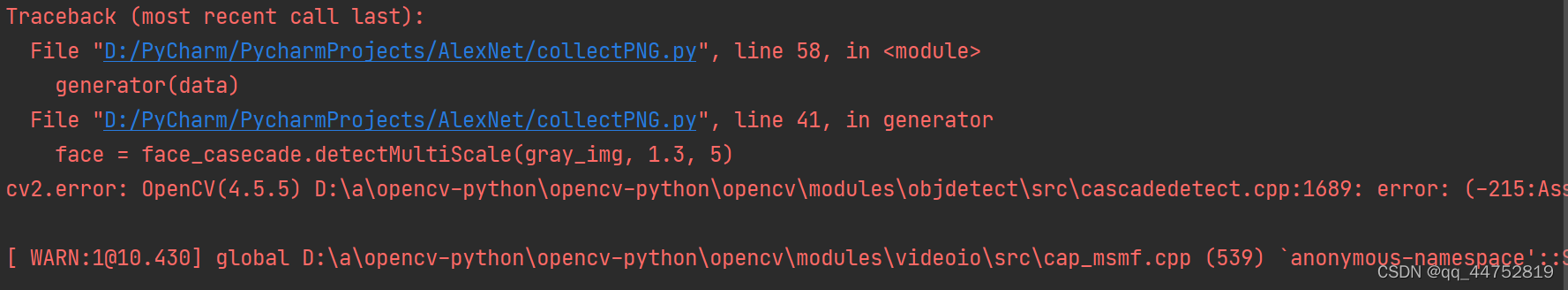 最近在使用Python自带的OpenCV库进行人脸识别时,遇到了如下报错: