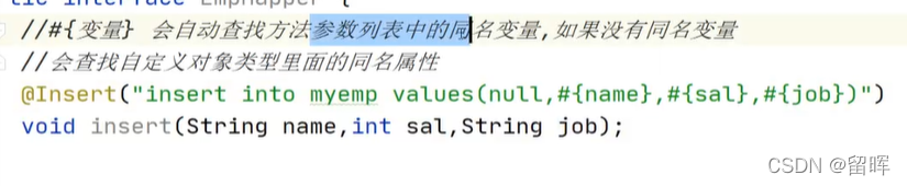 @Insert("insert into myemp values(null,#{name},#{sal},#{job})")