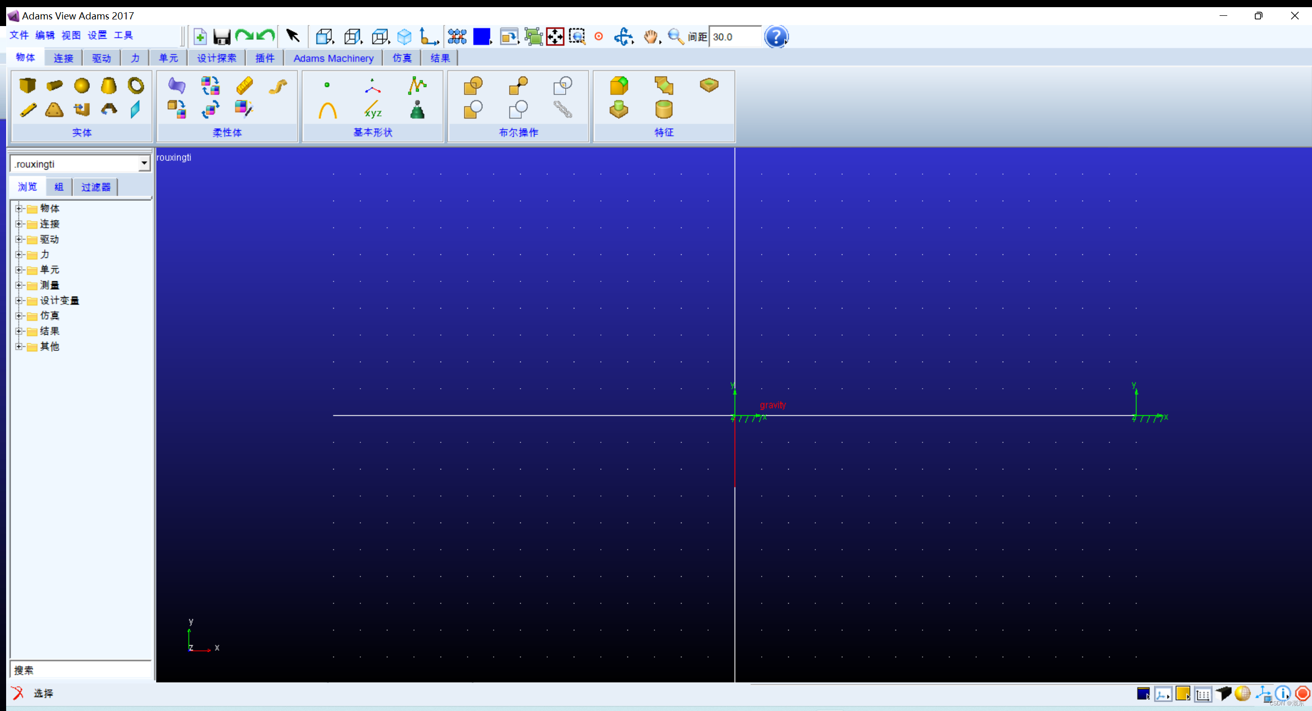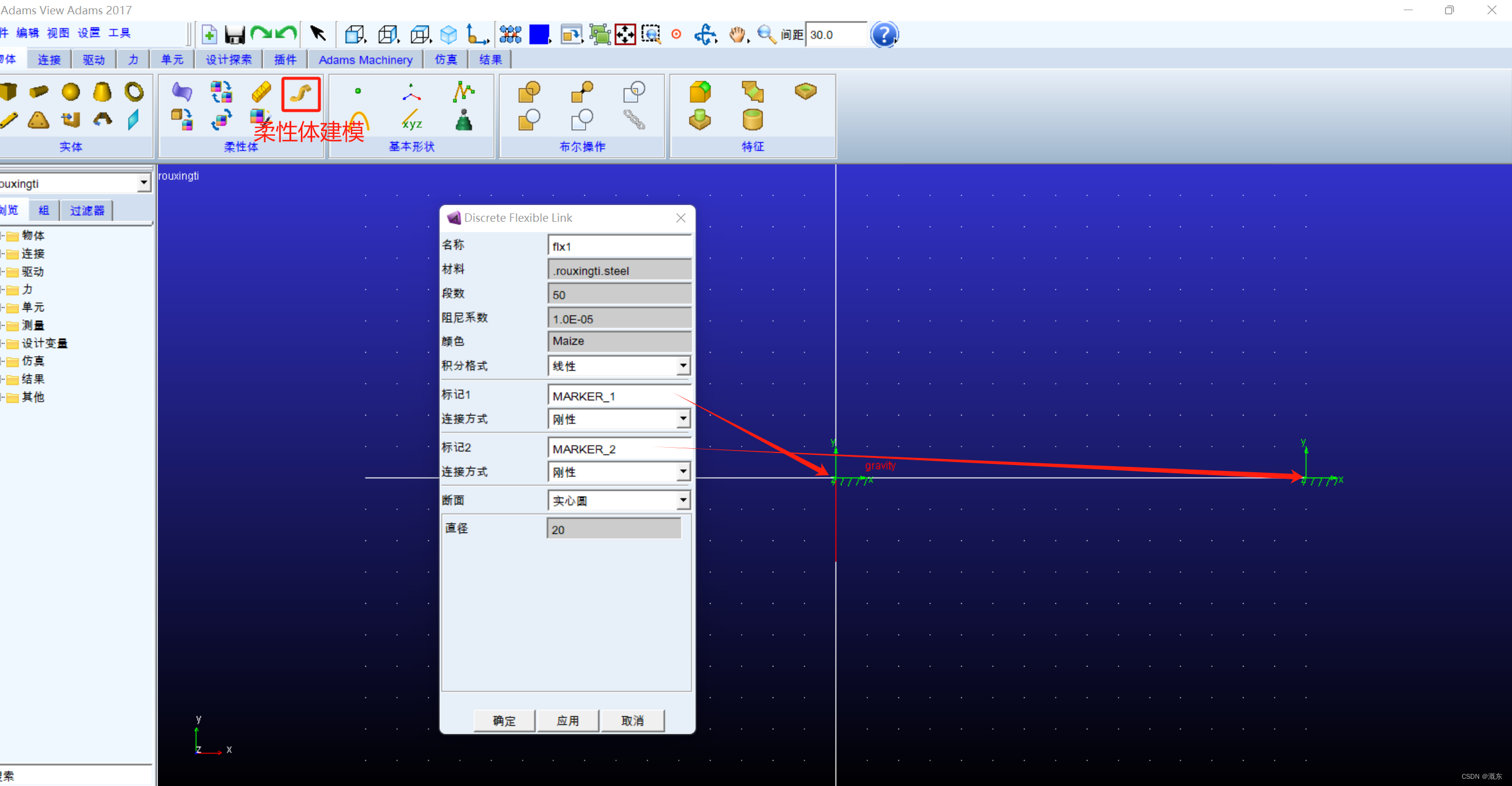②创建柔性体建模:命名,选择刚刚标记的两个marker点,选择连接方式:刚性,选择材料为实心圆