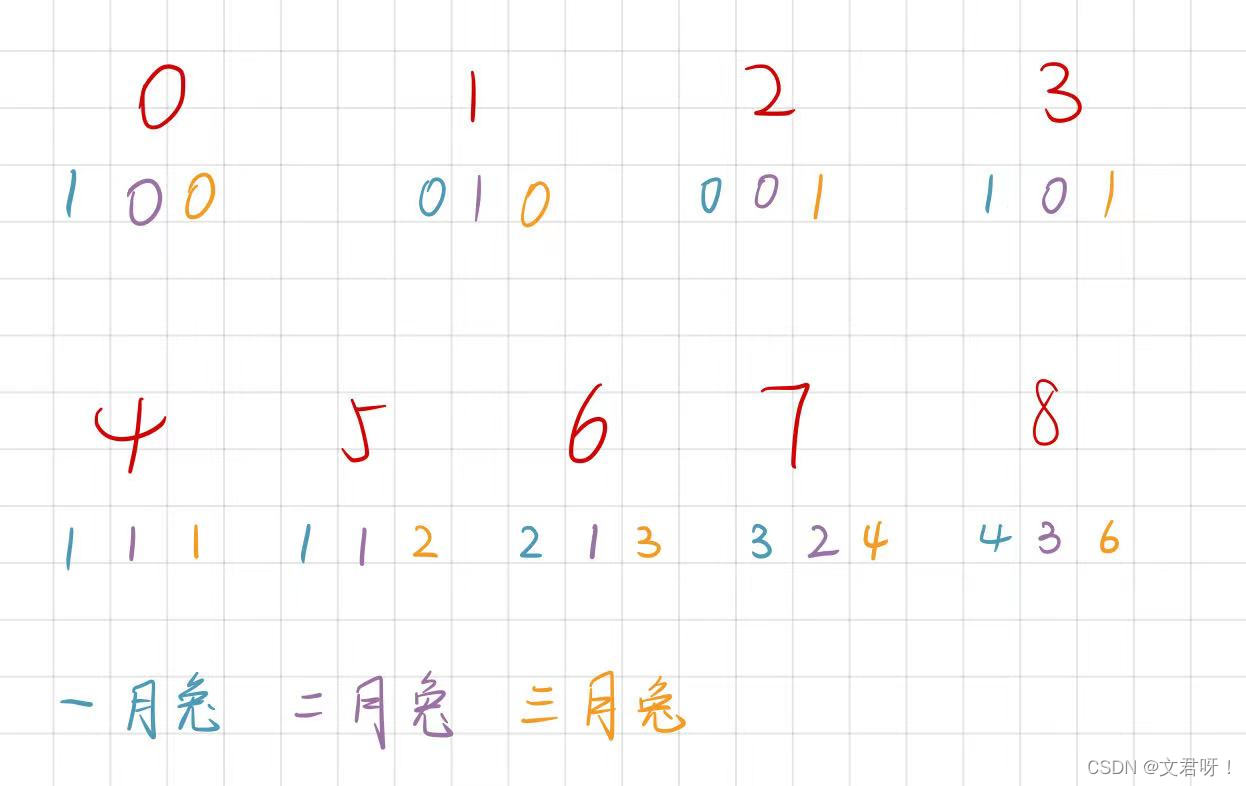 古典问题:有一对兔子,从出生后第3个月起每个月都生一对兔子,小兔子长到第三个月后每个月又生一对兔子,假如兔子都不死,问每个月的兔子总数为多少?
