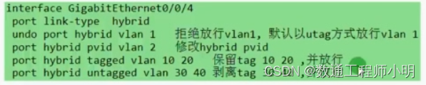 Hybrid接口与Trunk接口类似,也是可以让多个Vlan的数据帧通过,这些数据帧也是通过802.1Q的Tag实现区分,和Trunk的区别是Hybrid接口可以灵活指定发送Vlan数据帧时是否携带Tag标记。