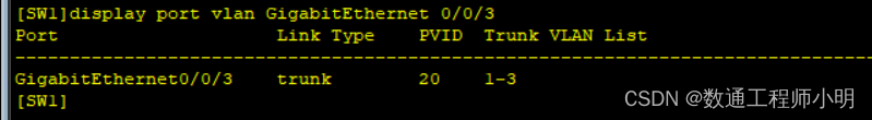 | [SW1]display port vlan GigabitEthernet 0/0/3 | 查看接口放行的VLAN |
