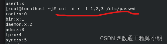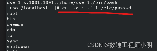 Cut -d(定义间隔符):(以“:”为间隔符)-f(第几列)1(第一列) 加文件名