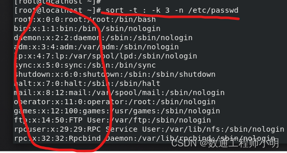 这句话是sort排序的,-t以“:”为间隔符(间隔符必须指定),-k要提取第几列的信息,将第三列以数字形式提取,对保存用户信息这个文件执行操作/etc/passwd
