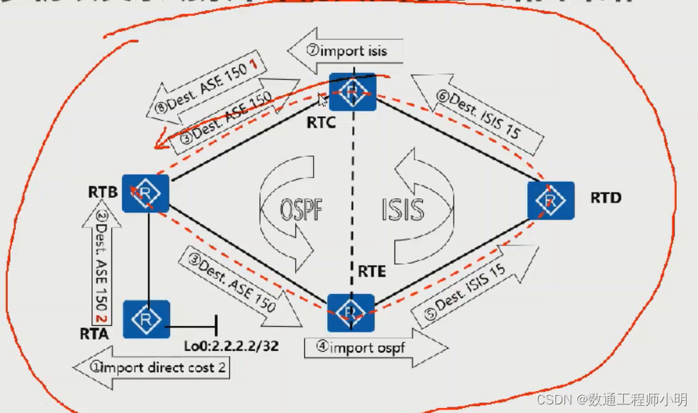 R1是ASBR,R3这个时候也成为了ASBR,在R2上学到两条去往相同目的网络的LSA(192.168.2.0),由于引入的ISIS度量值为1小,R1产生度量值大为2,这个时候环路就产生了。