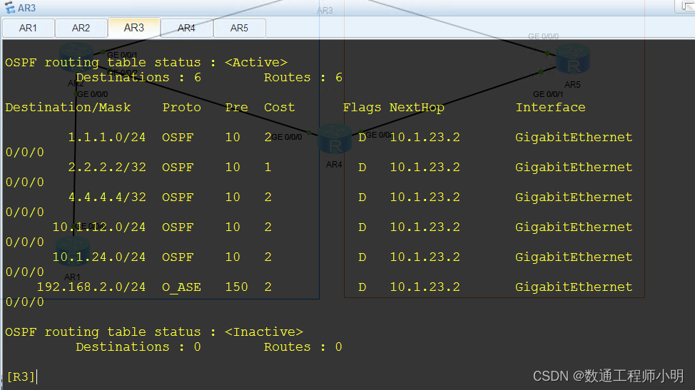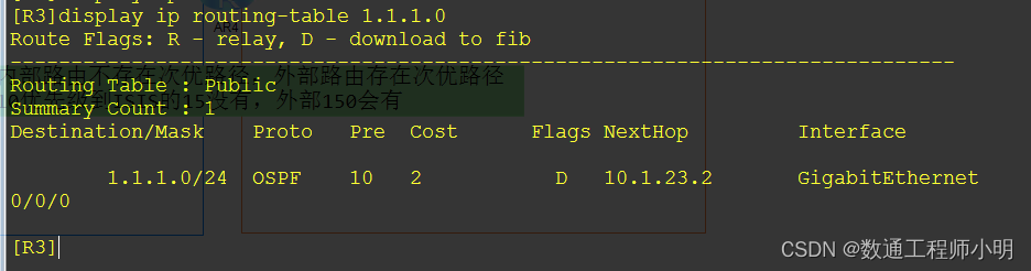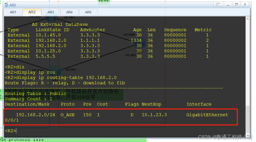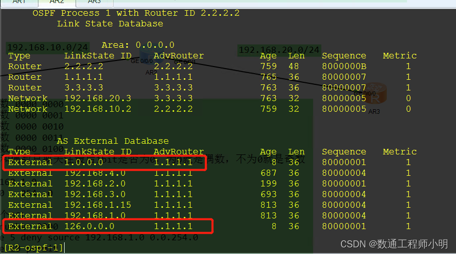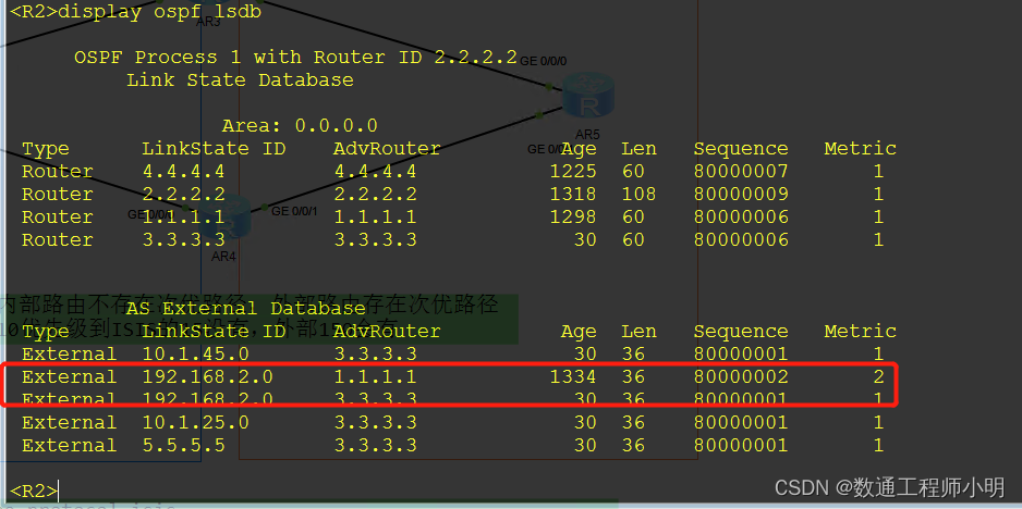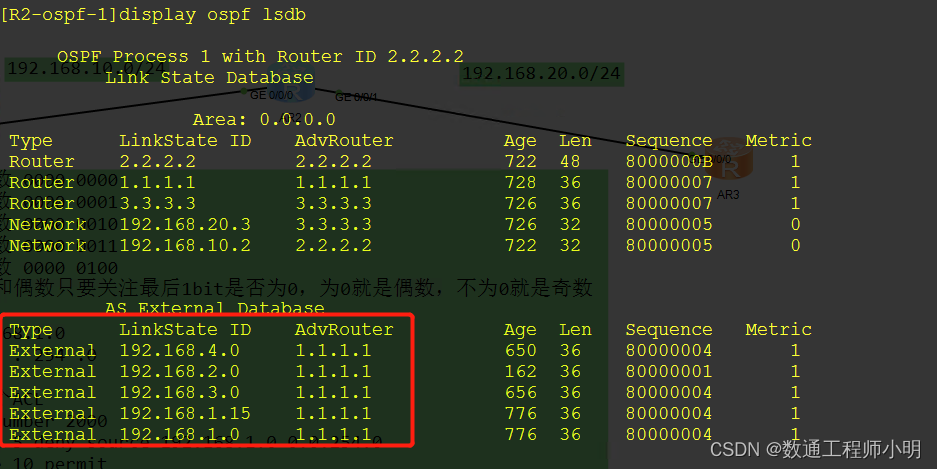 但是R2身后的R3依旧有这些外部路由:OSPF之间传递LSA,无法被过滤,只能过滤路由产生的结果,但LSA依旧会泛洪给邻居。