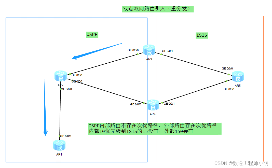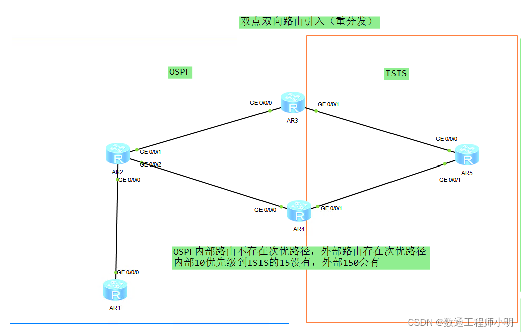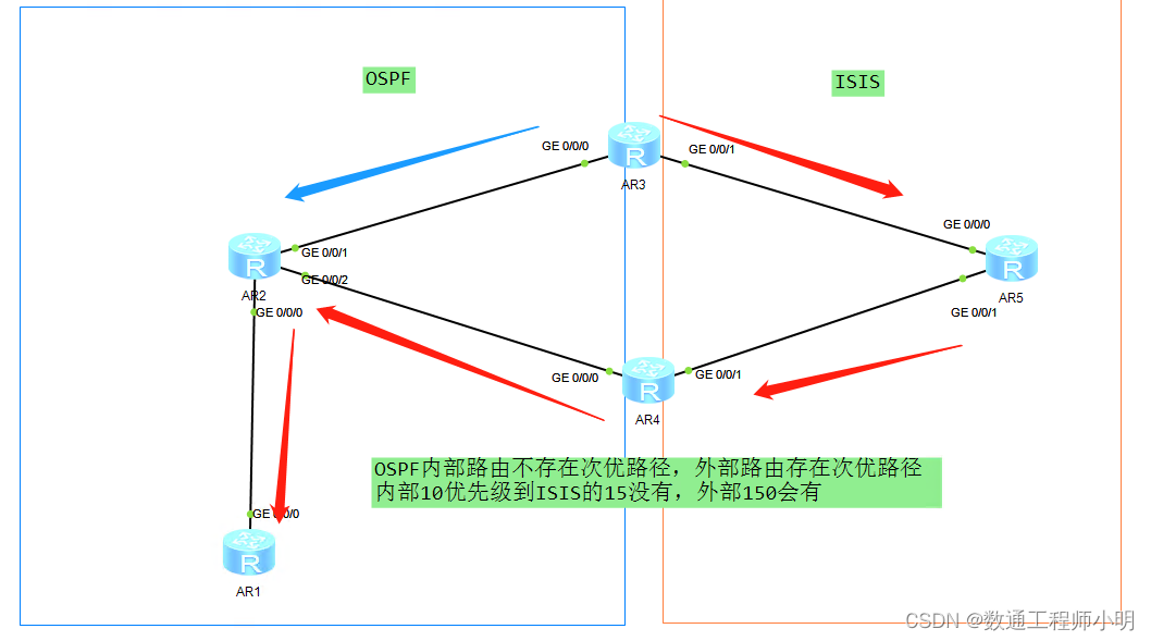 次优路径产生的原因?协议优先级导致的问题,优先级低的路由引入到路由优先级高的协议中,产生次优路径,反之没有。