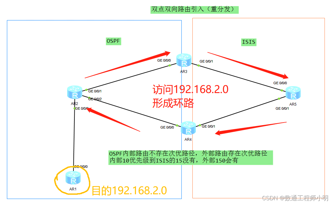 产生环路的根因就是OSPF已经有一条外部路由了,进入到ISIS后优先级发生改变,再到OSPF引入到ISIS,环路产生。