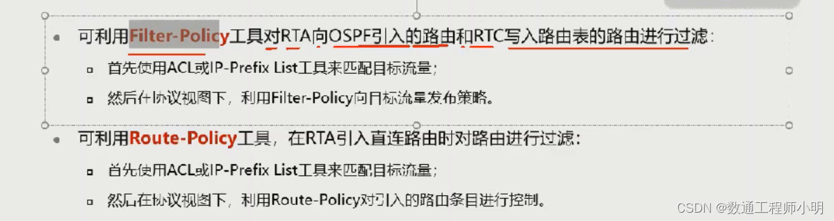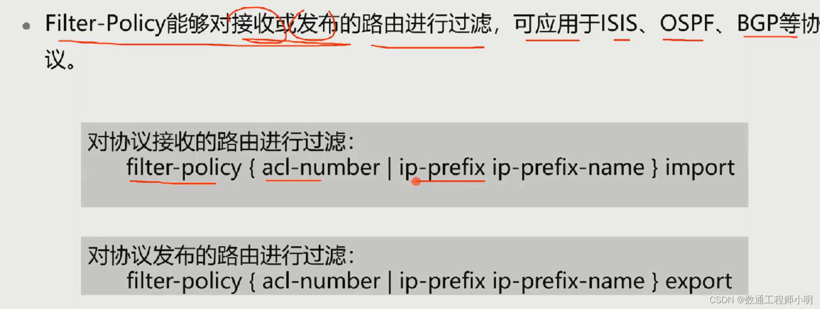 @Filter-Policy:RIP、OSPF、ISIS、BGP协议都可以使用Filter-Policy对路由进行过滤。