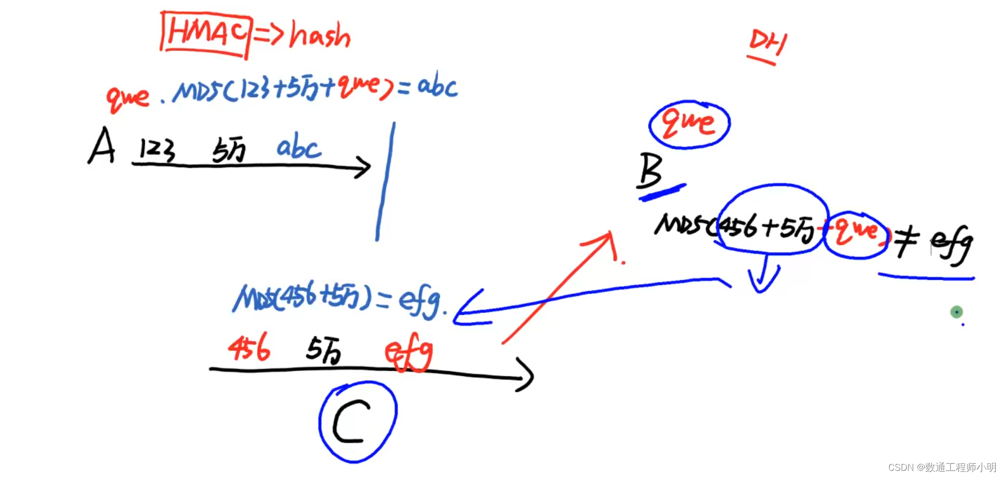 HMAC哈希信息验证码:带秘钥的哈希,传输哈希前先通过DH算法协商秘钥(全球唯一),秘钥不加密,参与哈希计算,A做完哈希后加上秘钥发送B,C由于没有秘钥,修改了数据发送给B也无法验证成功。