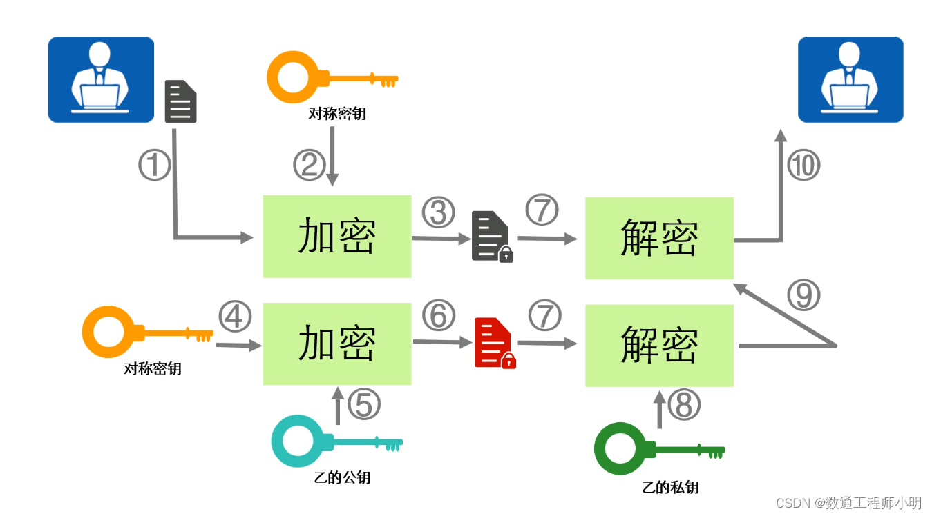 A用对称密钥加密数据,再用B的公钥封装对称密钥,B收到用私钥解密得到对称密钥,再用对称密钥解密业务数据。