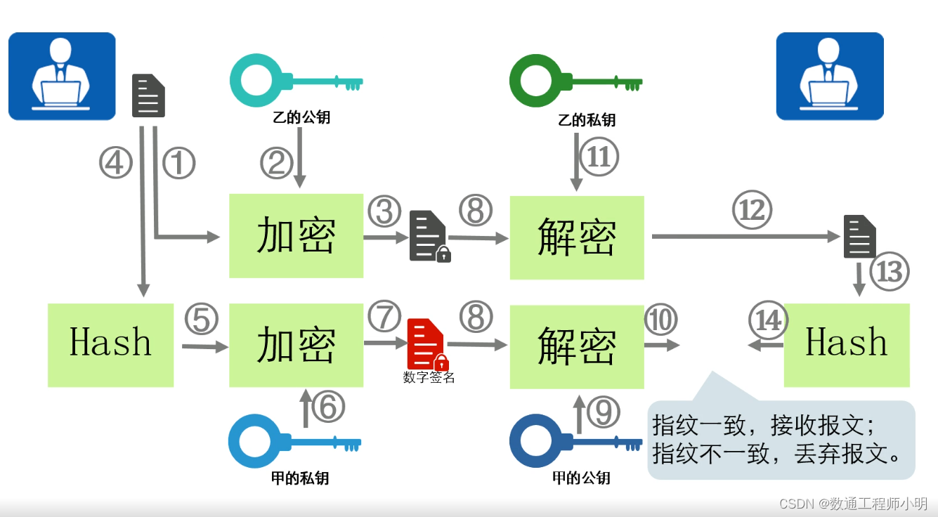 (3)、B收到数据后,使用A的公钥解密签名,得到了一个哈希值。