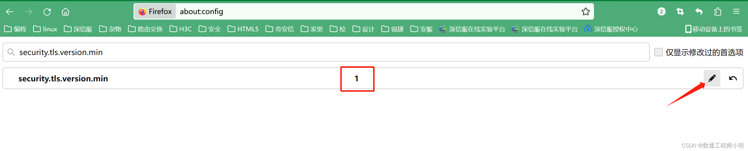 3、修改security.tls.version.min项的值,一般是3和2,修改为1,降到最低,然后就可以访问了,工作环境不建议长期开启,安全性。