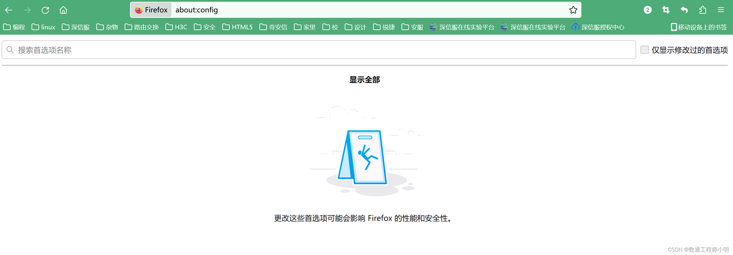 1、火狐浏览器地址栏输入 about:config,会出现一个提示,点击接受风险并继续。