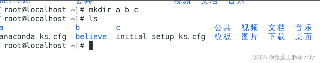 • mkdir a b c:当前路径创建a、b、c三个目录。