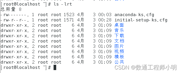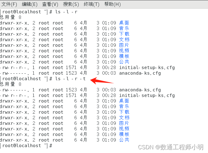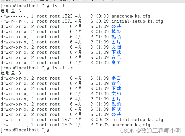 • 单独执行ls -r和执行ls没什么太大区别,带着-l参数一起就会有不同,默认按照文件名逆序显示。