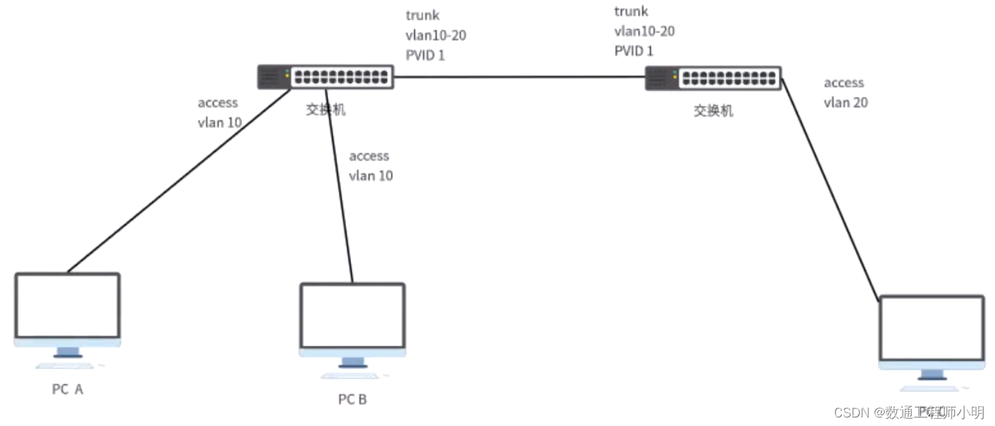 - 方法1:利用Trunk链路的收发标签特性,交换机之前的Trunk口,左边连接A和B的交换机中继本征vlan设置为10,右边连接C的交换机中继本征vlan设置为20,这样由于A和B上来会打上VLAN10的标签,到了中继链路由于本征VLAN是VLAN 10会把vlan 10的Tag剥离发送,到了对端由于数据流没打标签,这边本征VLAN是20,就会打上VLAN 20的Tag发走,最终到达主机C,主机C的回包也是一样。