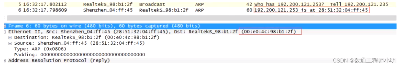 - “192.200.121.253的MAC地址是28:51:32:04:ff:45”这样,主机A就知道了主机B的MAC地址,它就可以向主机B发送信息了。同同时它还更新了自己的ARP缓存表,下次再向主机B发送信息时,直接从ARP缓存表里查找就可以了,ARP缓存表采用了老化机制,在一段时间内如果表中的某一行没有使用,就会被删除,这样可以大大减少ARP缓存表的长度,加快查询速度。
