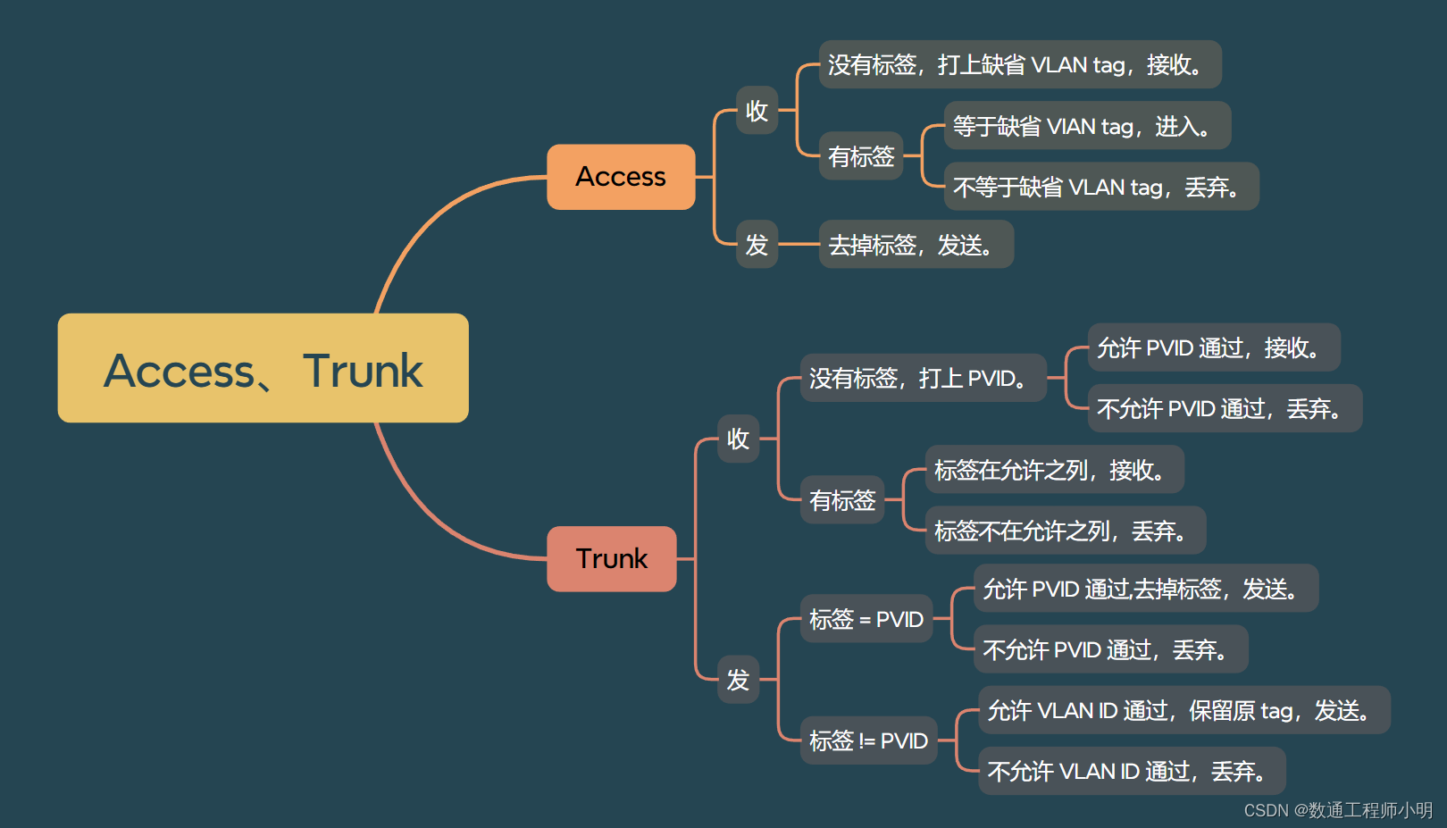 - Trunk口(干道口):Trunk口是用于连接交换机之间的端口,用于传输多个VLAN的数据包。它可以同时传输多个VLAN的数据,通过使用标记(Tagging)来区分不同的VLAN。Trunk口通常用于连接交换机之间,以实现VLAN的扩展和互联。当数据包从Trunk口进入交换机时,交换机会根据标记的VLAN ID将其转发到相应的VLAN。