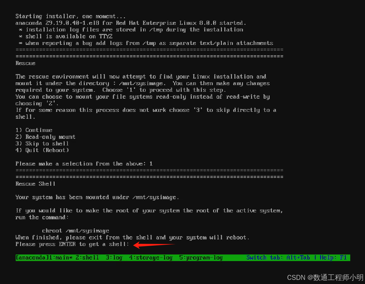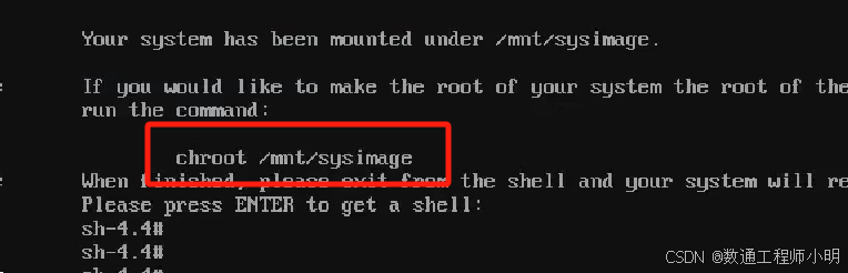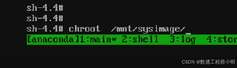 (5)、输入chroot /mnt/sysimage进了真系统,用光盘启动,把真正的硬盘挂载到了假系统(光盘的系统)的sysimage系统上了