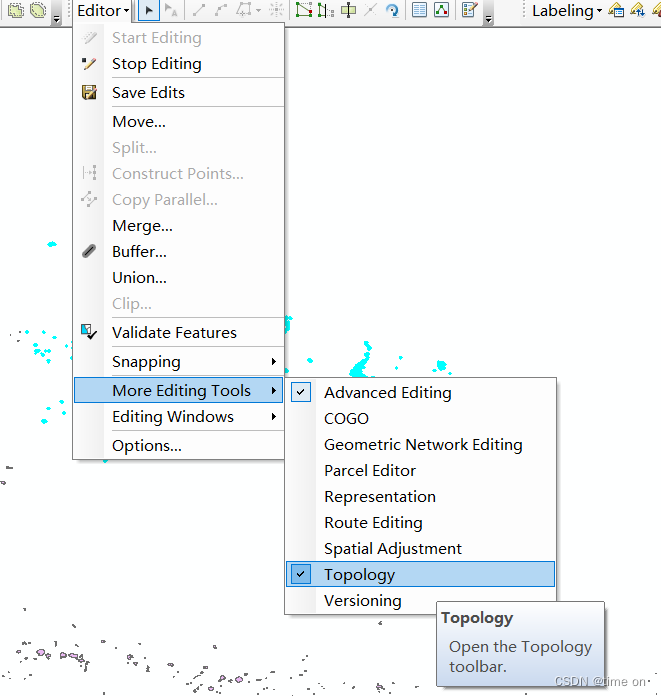 3. 检查拓扑错误。将Catalog中的数据图层拖入到图层目录,然后启用编辑,在Editor下拉选项中选择“More Editing Tools”——“Topology”,此时可以看到Error Inspecor(错误检查器)是可用状态,点击最右侧的图标,即错误检查器,可以看到数据源中存在多少错误。将Catalog中生成的拓扑图层载入到图层目录,即可看到错误的位置。